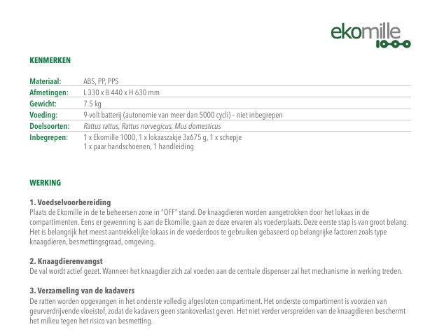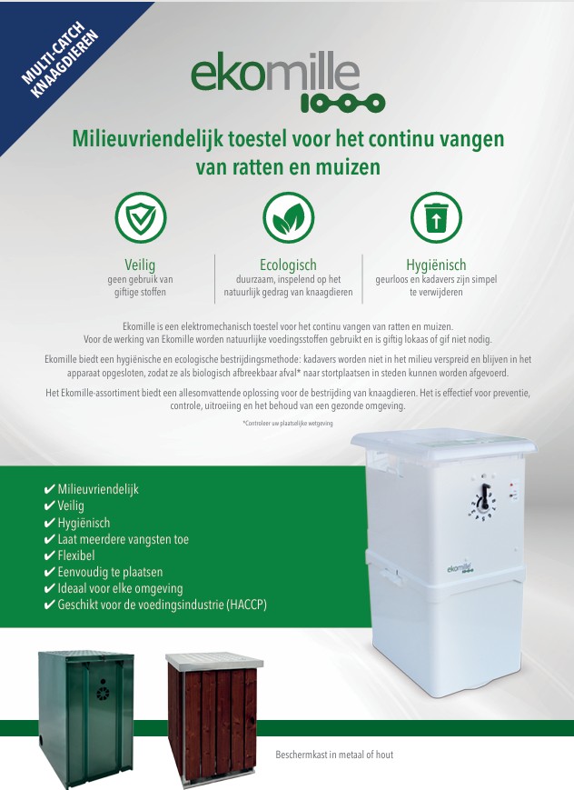 L’Ekomille est un système très efficace pour la capture en continu des rongeurs de façon écologique. Tout type d’appât peut être utilisé. Quand les rats et/ou les souris mangent de la nourriture naturelle dans cet appareil, un capteur est activé et met en marche un mécanisme de rotation sophistiqué, permettant le rongeur de glisser dans le réservoir inférieur. Les rongeurs capturés sont endormis de façon respectueuse, puis ils meurent quasi directement, sans stress. Les rats et/ou souris sont conservés par le liquide dans le compartiment inférieur de façon naturelle.